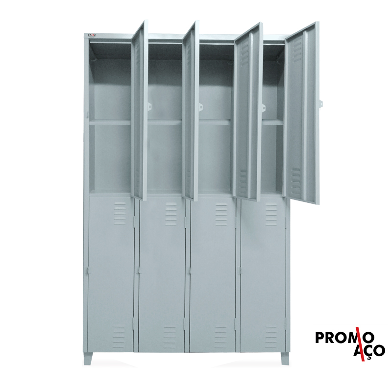 Está procurando aquele móvel para guardar seus pertences ou de seus funcionários? Aqui na PromoAço você encontra uma variedade de Roupeiros de aço com portas grandes e pequenas. O Roupeiro para vestiário com 8 portas grandes com prateleira interna Fatto possui espaço para armazenar suas roupas ou mochila. O guarda volume com 8 portas grandes Fatto ainda conta com sistema de ventilação nas portas o que facilita ao armazenar roupas molhadas. Fácil para limpar, o armário guarda volume com 8 portas Fatto possui pés fixos em aço com 8cm de altura o que permite a lavagem do ambiente sem danificar o móvel. Dê um upgrade em seu vestiário com o roupeiro de aço com 8 portas grandes Fatto.